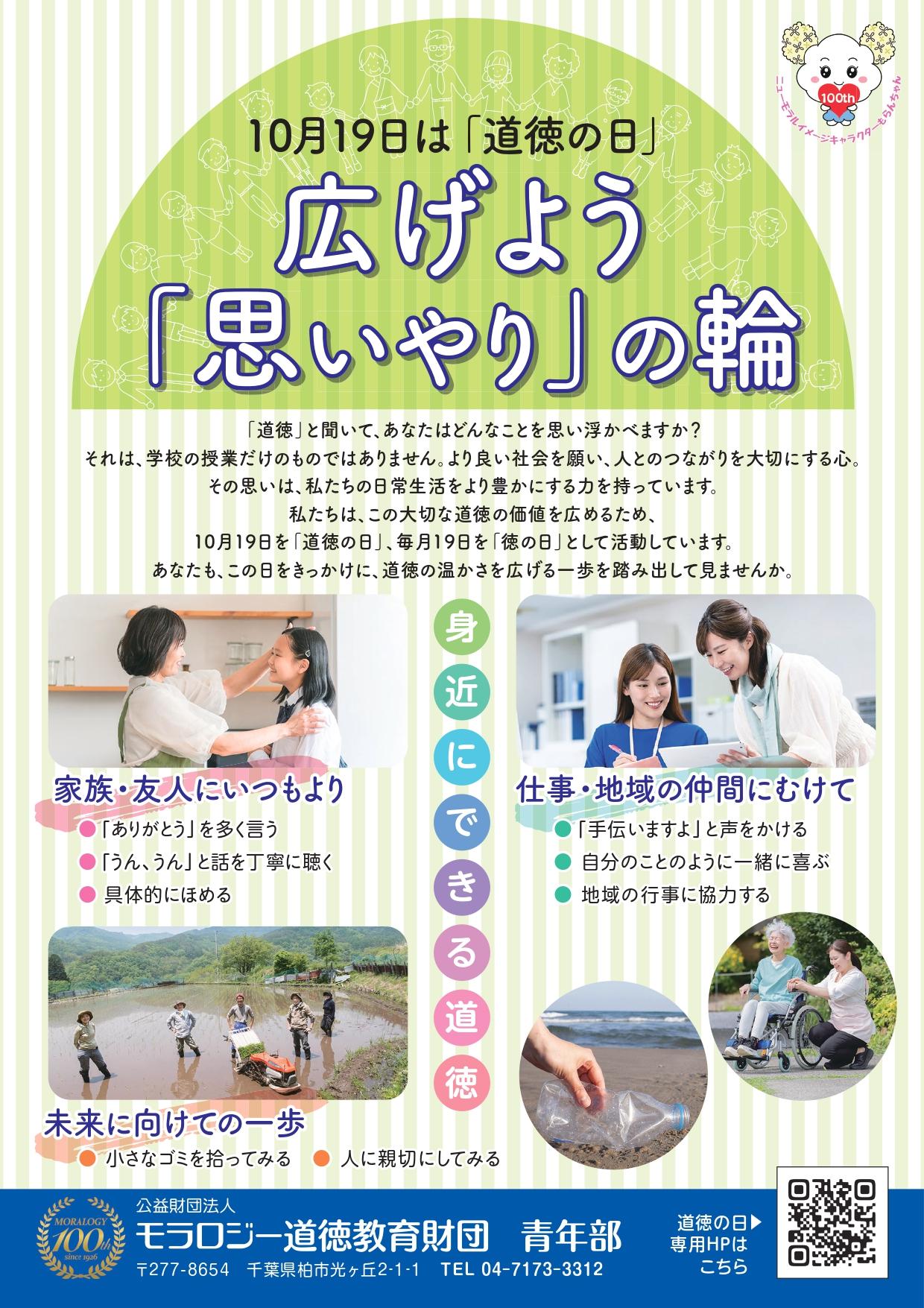 公益財団法人モラロジー道徳教育財団 青年部は、10月19日を「道徳の日」に制定するための推進プロジェクトを開始し、各ブロックの青年代表が中心となって全国一斉に活動を展開しています。