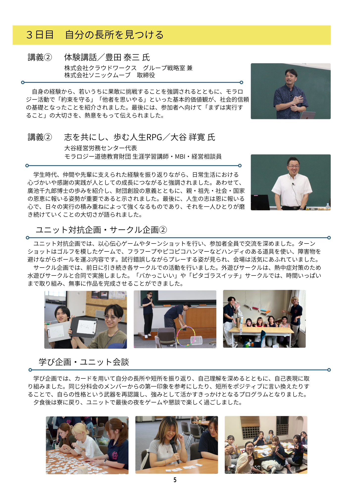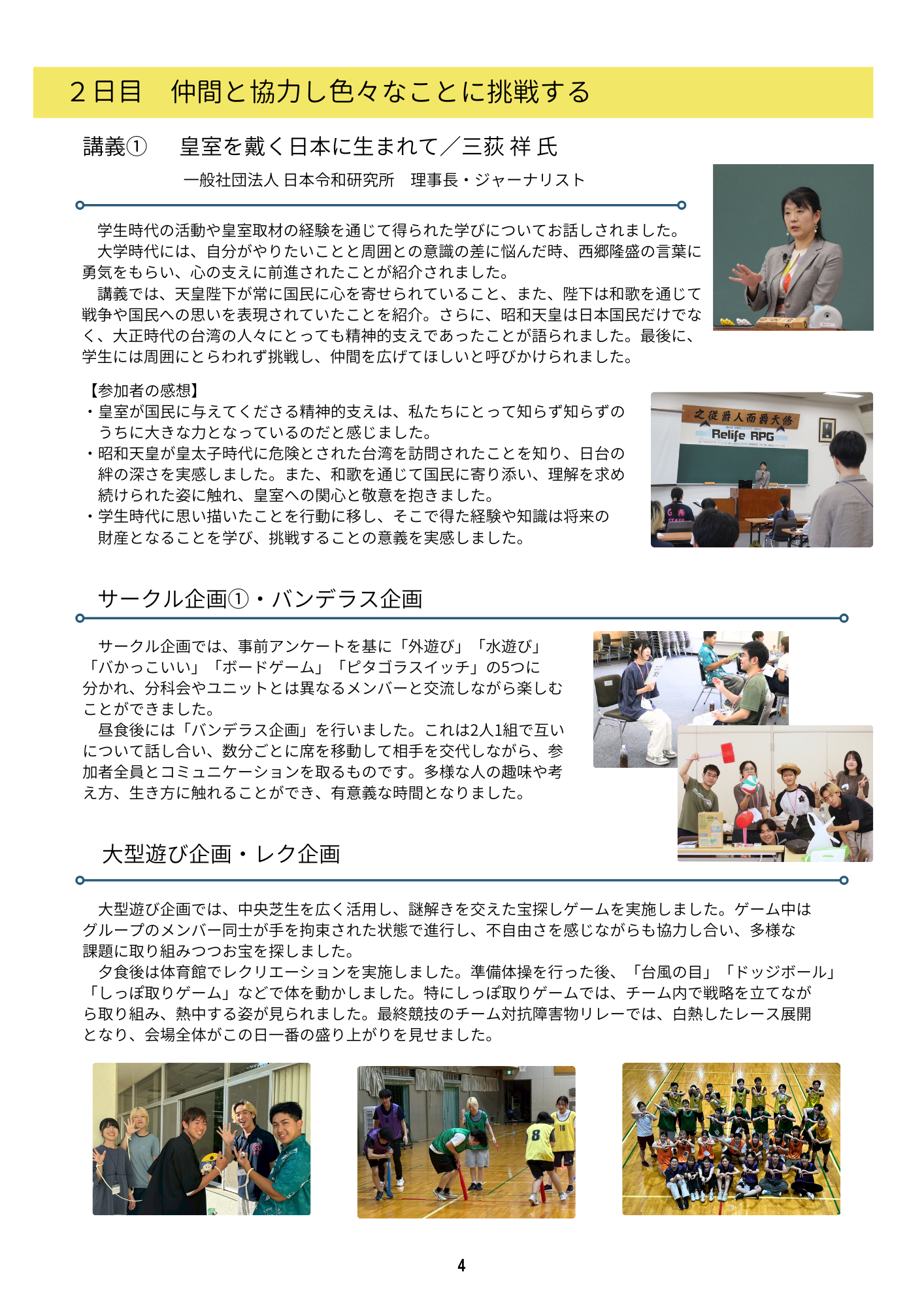 レクリエーションに始まり、心づかいの大切さと自国の歴史に学ぶ講義やディスカッション、学生オリジナルの企画やワークショップと、楽しく学び、これからの将来に役立つ内容を用意しています。